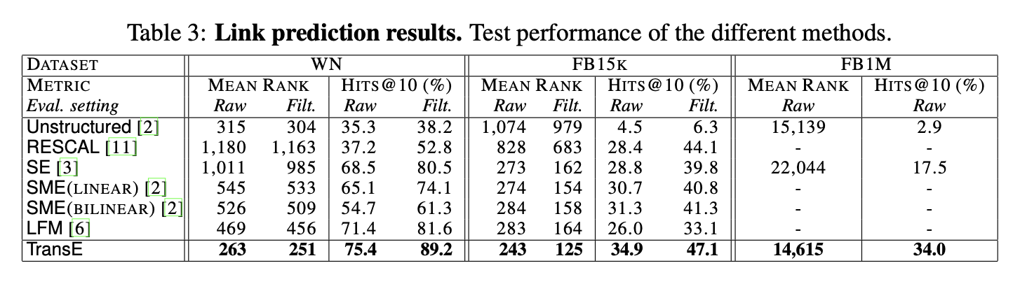 TransE与无平移版本(Unstructured)的对比凸显了平移项的重要性。Unstructured虽在WN上平均排名接近最优,但hits@10极低,因其仅将共现实体聚类而忽略关系语义。例如在FB1M上,两者平均排名相近,但TransE的top10预测数量是Unstructured的10倍。