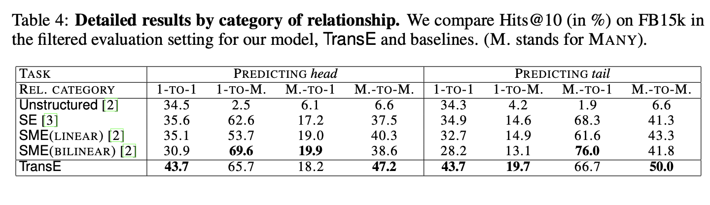 表4根据关系类型及预测参数对FB15k数据集的hits@10结果进行分类。关系依据头实体和尾实体的基数特性划分为四类:1-TO-1(一对一)、1-TO-MANY(一对多)、MANY-TO-1(多对一)、MANY-TO-MANY(多对多)。