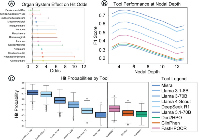 通过 二项式广义估计方程 (GEE) 并在患者水平聚类的条件下建模,我们发现 器官系统对 HPO 分配准确率的影响有限(图 6A),仅在心血管、泌尿生殖和头颈部表型中表现出略高的正确分配概率(比值比约 8–11),其余系统大多接近 1。随着 节点深度增加,所有工具的性能均呈单调下降趋势(图 6B),预测命中率从浅层节点(≤3)向深层节点(≥10)逐渐降低。最显著的差异来自 工具选择(图 6C):几乎所有 RAG-HPO 配置均显著优于 FastHPOCR、ClinPhen 与 Doc2HPO,其中 RAG-HPO + LLaMA-3.1 70B 在全深度范围内始终保持最高的预测命中概率,凸显其在复杂与特异性表型识别中的优势。