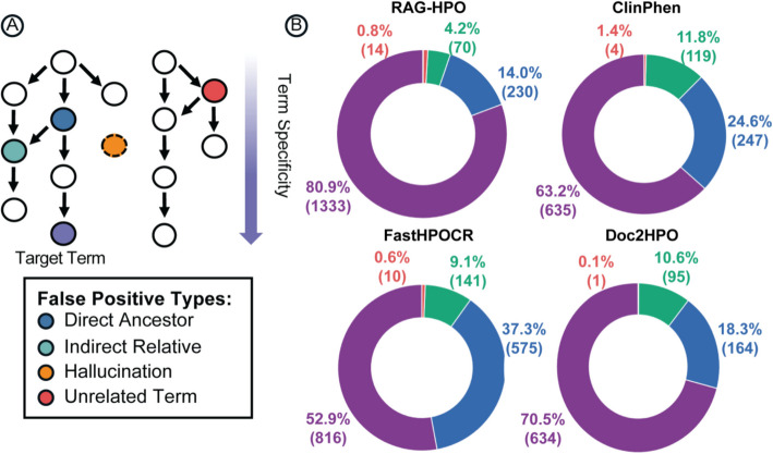在 HPO 分析中,我们将假阳性术语进一步细分为 直接祖先、间接相关(远亲)、完全无关以及幻觉 四类,以揭示其形成原因和潜在价值(图 7A)。结果显示,RAG-HPO + LLaMA-3.1 70B 共产生 315 个假阳性,其中 绝大多数为目标术语的祖先或远亲(95%),仅 14 个(4%)为不相关术语,且真正的幻觉仅 1 个(<1%)(图 7B)。其他 RAG 配置呈现类似模式,但与 LLaMA-3 70B 或 LLaMA-4 Scout 等较低对齐模型组合时,不相关术语比例更高。相比之下,基于规则的工具(FASTHPOCR、ClinPhen、Doc2HPO)虽然没有幻觉,但远亲术语依然占 62–79%。值得注意的是,RAG-HPO 的不相关术语并非源于 LLM 的自由生成,而主要由语义相似性检索结果不佳所致,因 LLM 必须在返回列表中强制选择术语,偶尔会导致语义不符的分配。整体来看,大多数假阳性依然提供了临床相关性,强调了根据下游应用需求灵活选择“最具体”还是“较广泛但相关”术语的重要性。