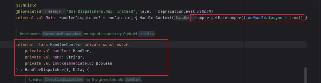 Dispatchers.getMain()指定了一个invokeSuspend处理线程,即主线程。这里通过工厂方法返回一个HandlerDispatcher,如下,