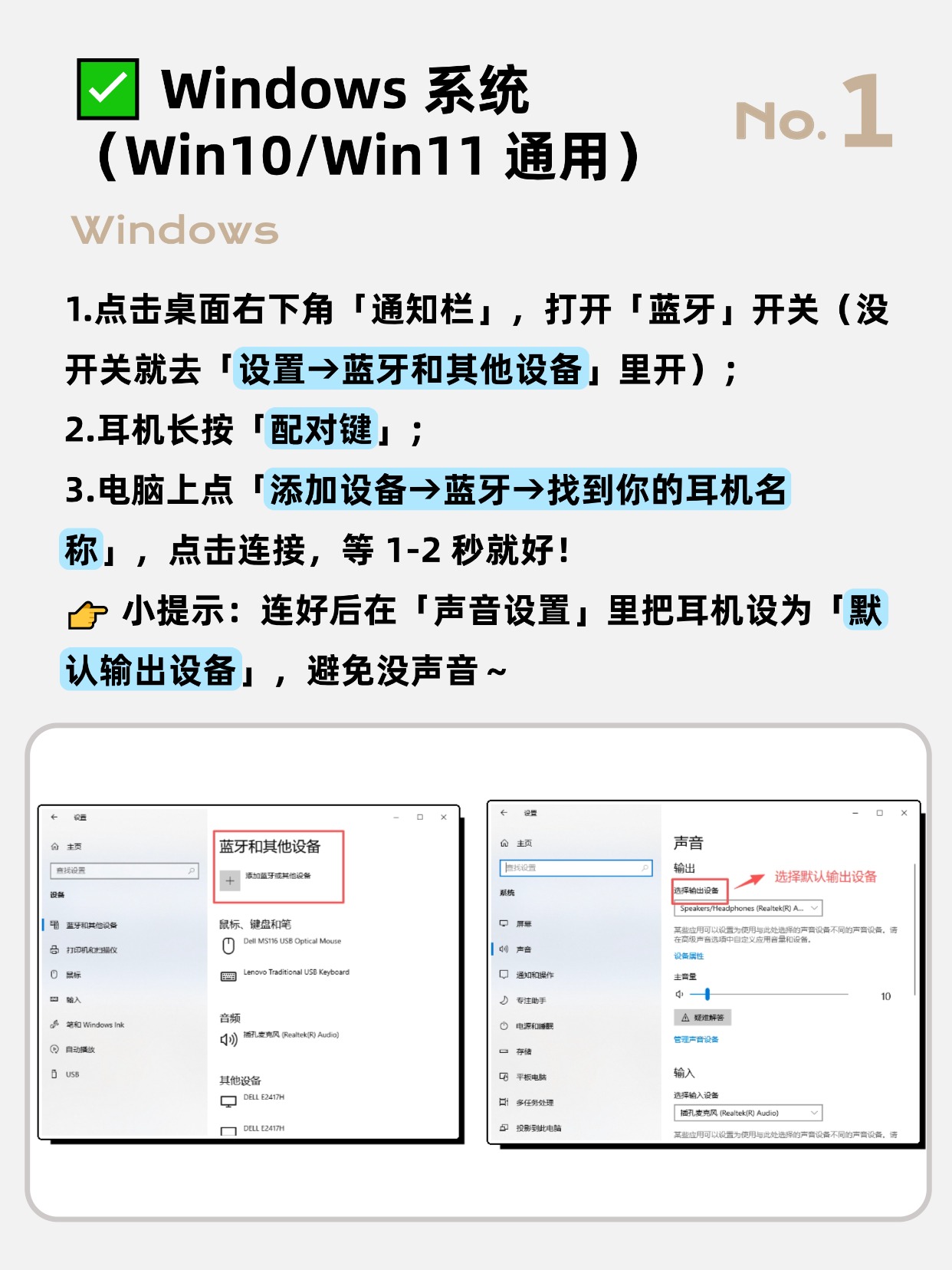 3.电脑上点「添加设备→蓝牙→找到你的耳机名称」,点击连接,等 1-2 秒就好!👉 小提示:连好后在「声音设置」里把耳机设为「默认输出设备」,避免没声音~