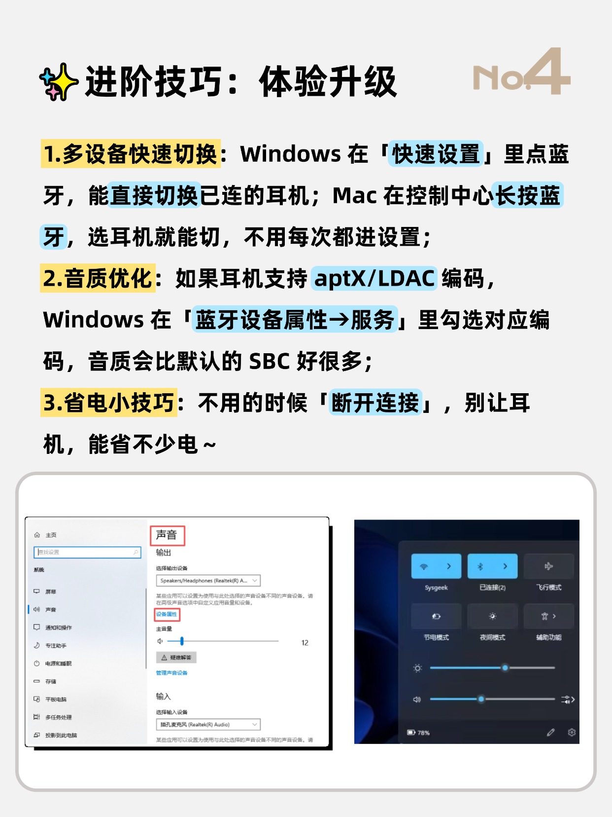 1.多设备快速切换:Windows 在「快速设置」里点蓝牙,能直接切换已连的耳机;Mac 在控制中心长按蓝牙,选耳机就能切,不用每次都进设置;