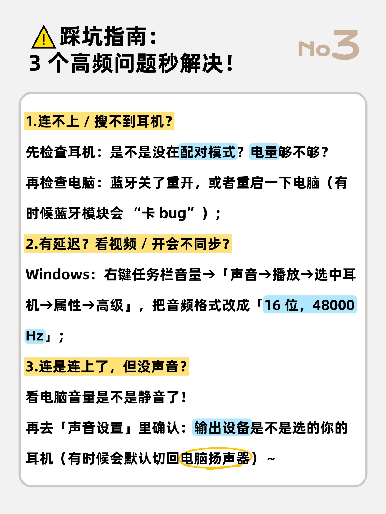 Windows:右键任务栏音量→「声音→播放→选中耳机→属性→高级」,把音频格式改成「16 位,48000 Hz」;
