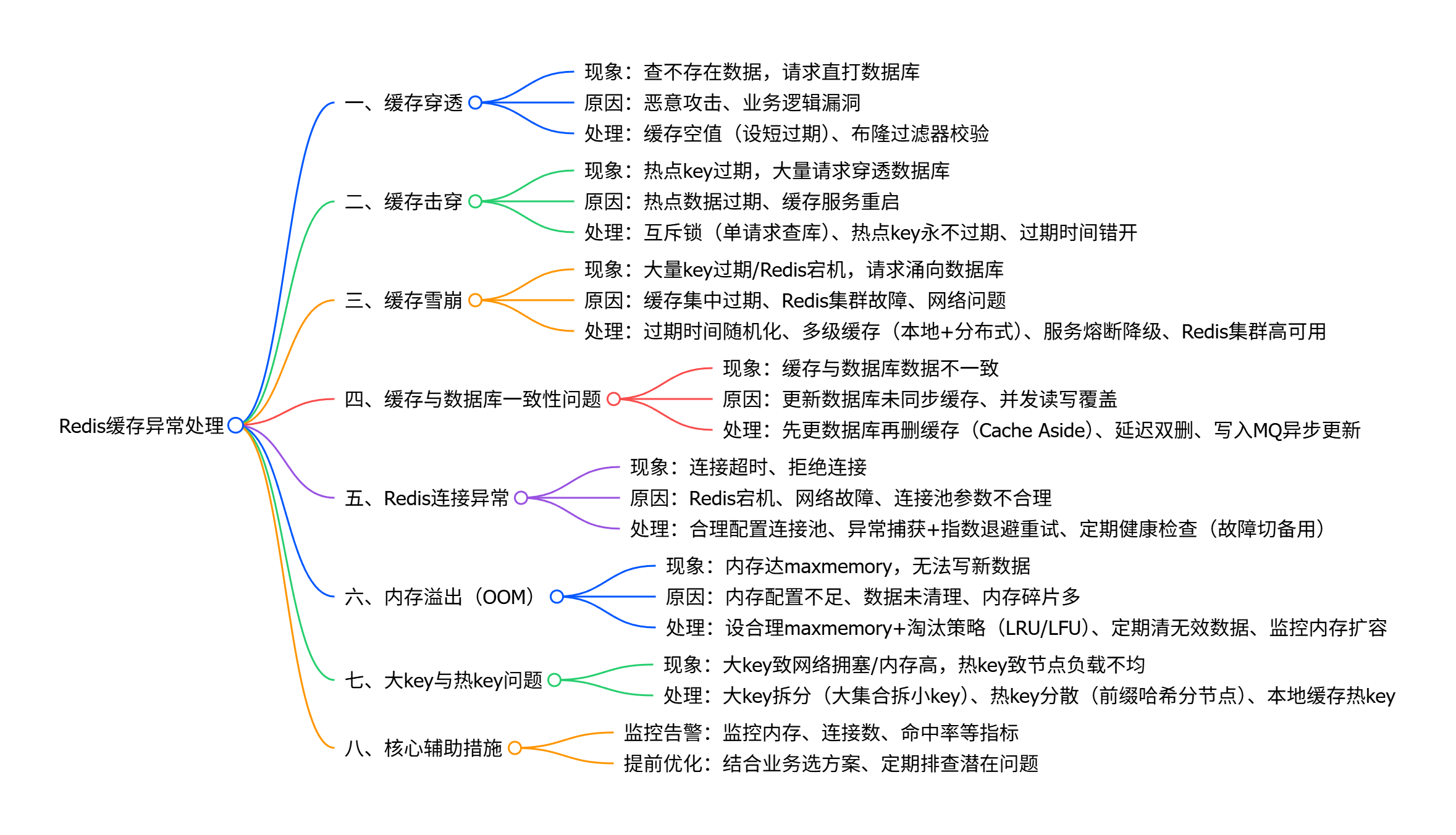 处理缓存异常时,需结合业务场景选择合适方案,同时加强监控告警(如 Redis 内存、连接数、命中率等指标),提前发现并解决潜在问题。