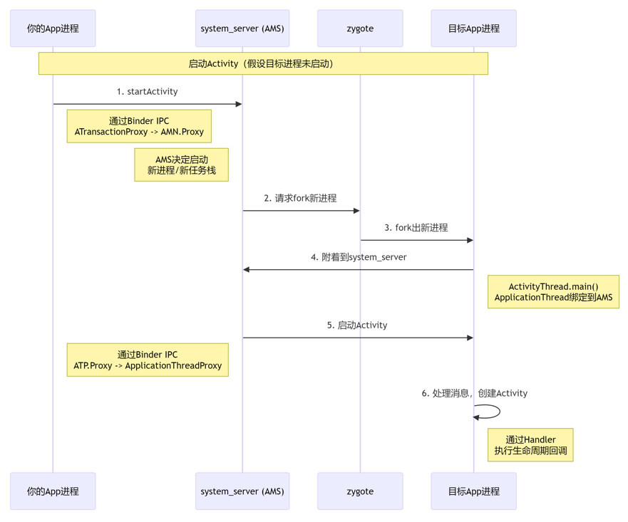 2 | system_server (AMS) | 目标App进程 | IApplicationThread | 指示目标进程创建并运行指定的Activity |