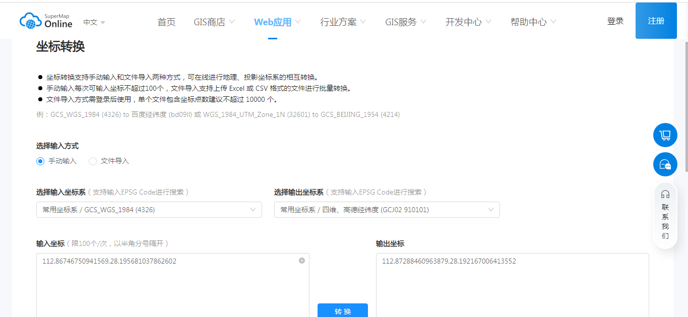 需要注意的是,在使用超图的在线坐标转换中,一次性输入的坐标数量是有限的,不超过100个,如果有批量坐标转换,需要按100进行拆分。