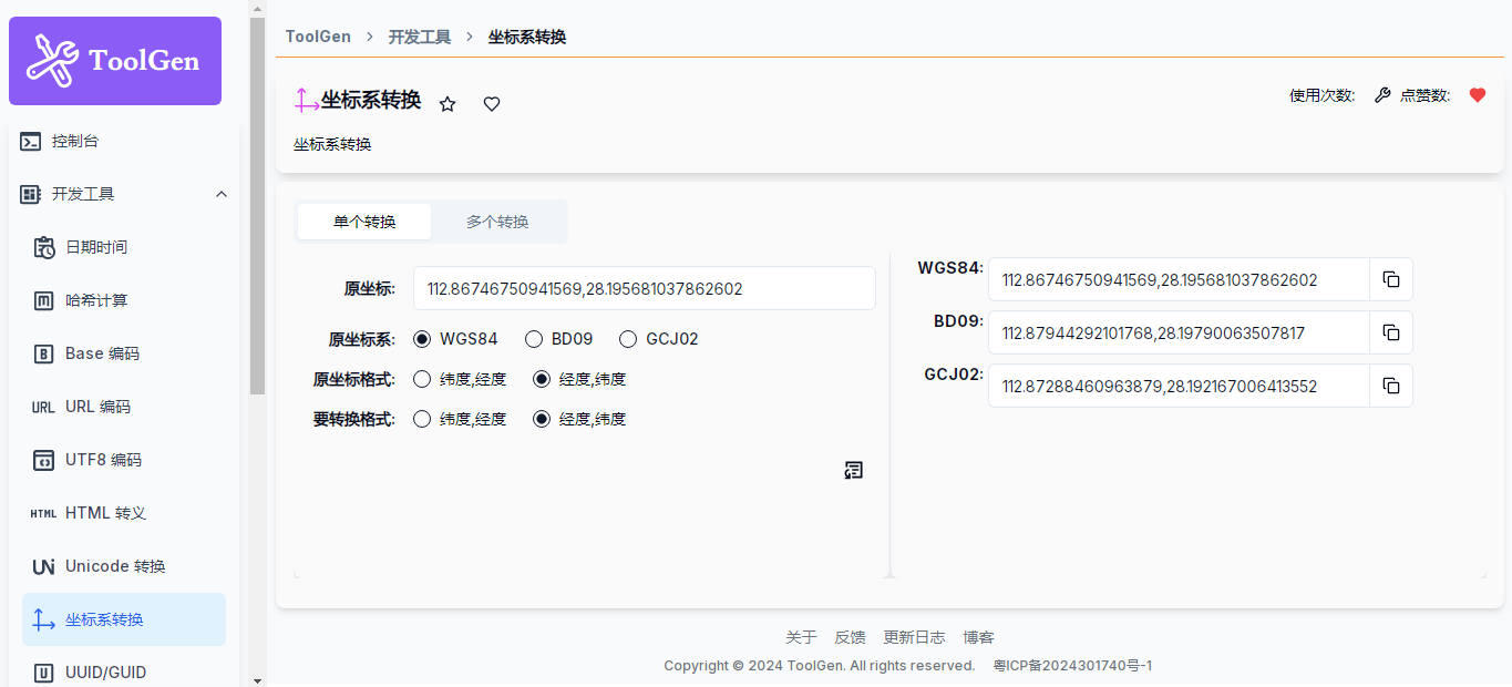 可以看到,ToolGen工具除了提供坐标转换外,还有很多其它的功能。不仅如此,对于坐标的转换服务,ToolGen是不仅提供单个坐标的转换,也提供了多个坐标的转换。同样的操作,在页面中输入原坐标后,并且选择原坐标系、原坐标格式(经度在前还是在后)后进行坐标转换,可以在右边看到转换结果。同样可以看到,使用在线转换后,对应的坐标结果如下: