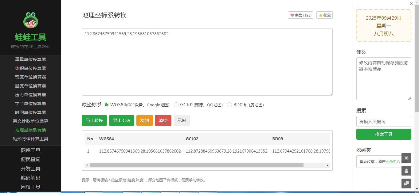 直接在线调用方式,通过调用网络上的坐标转换服务,如一些专业的GIS服务平台提供的API接口,开发者无需深入了解复杂的坐标转换算法,只需将待转换的坐标发送请求,即可获得转换后的结果。这种方式简单便捷,尤其适合一些对坐标转换精度要求不高、数据量较小且对实时性要求不苛刻的场景,如简单的地理信息查询、小规模的地图标注等。然而,其依赖网络连接,一旦网络状况不佳或服务提供商出现问题,将直接影响应用的可用性。此外,频繁调用外部服务可能产生额外成本,且数据安全性与隐私性也需谨慎考量。本节将分享三个可以直接在网页端进行直接使用的在线转换器,这种方式适用于初级用户,无任何代码能力,也不想去深入学习编程知识,对于坐标的数量要求不多。如果您目前是这种方式,那么直接接入在线调用的能力,无疑是提高开发效率的优良姿势。为了统一对比转换后的坐标值,这里我们采用一个WGS84的坐标,坐标值为: