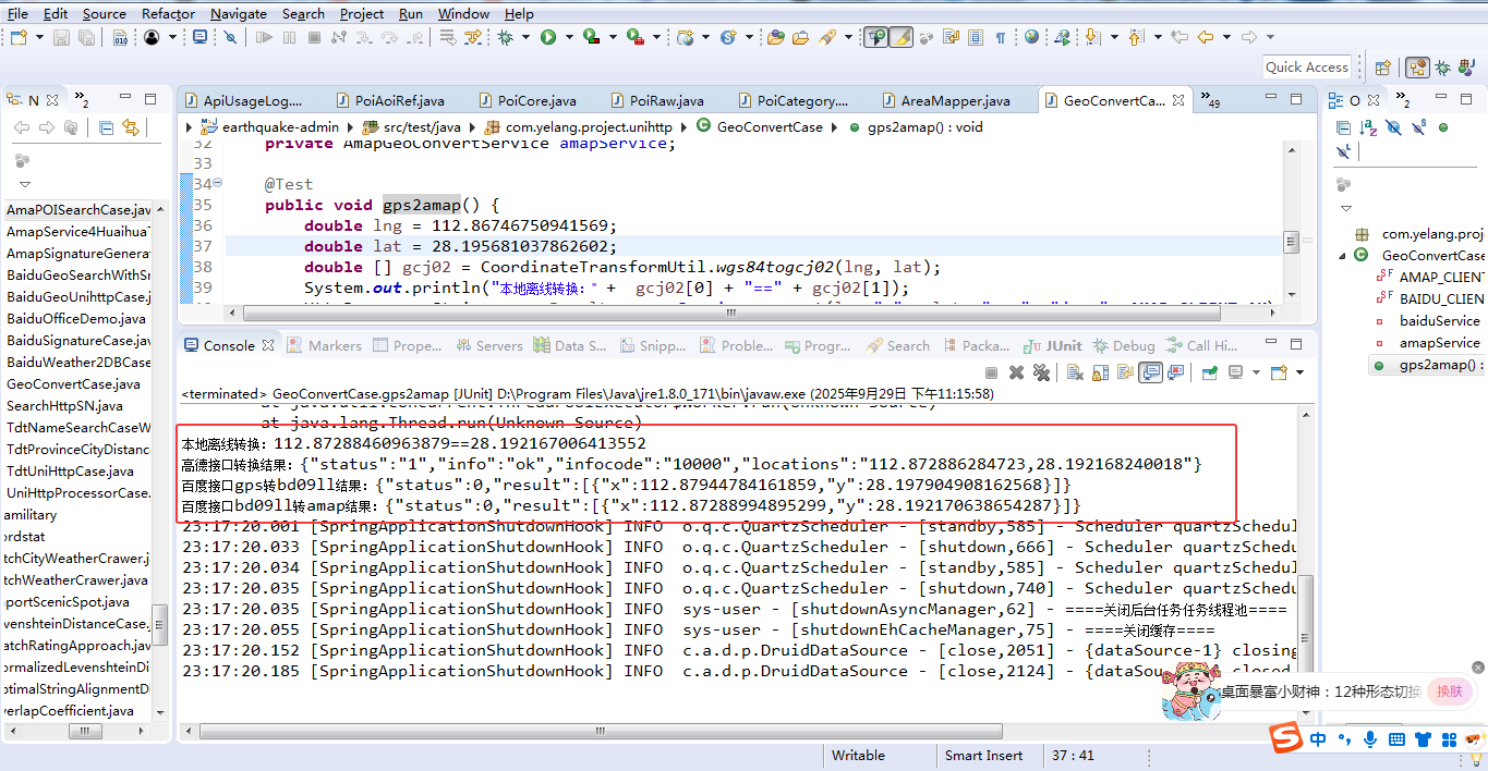 public class GeoConvertCase {/*** - 高德地图ak值*/private static final String AMAP_CLIENT_AK = "amap_key";/***- 百度地图ak值*/private static final String BAIDU_CLIENT_AK = "baidu_key";@Autowiredprivate BaiduGeoConvertService baiduService;@Autowiredprivate AmapGeoConvertService amapService;@Testpublic void gps2amap() {double lng = 112.86746750941569;double lat = 28.195681037862602;HttpResponse<String> amapResult = amapService.convert(lng+"," + lat, "gps", "json", AMAP_CLIENT_AK);System.out.println("高德接口转换结果:"+amapResult.getBodyResult());HttpResponse<String> baiduResult = baiduService.convert(lng+"," + lat, 2, "json", BAIDU_CLIENT_AK);System.out.println("百度接口gps转bd09ll结果:"+baiduResult.getBodyResult());//百度接口gps转bd09ll结果:{"status":0,"result":[{"x":112.87944784161859,"y":28.197904908162568}]}baiduResult = baiduService.convert("112.87944784161859,28.197904908162568", 5, "json", BAIDU_CLIENT_AK);System.out.println("百度接口bd09ll转amap结果:"+baiduResult.getBodyResult());}
