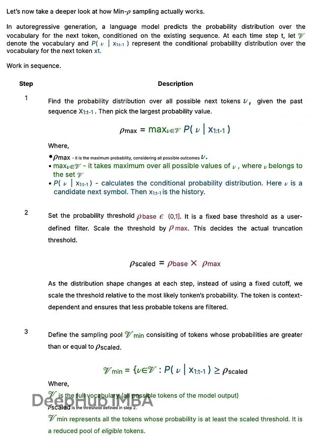 min-p 就提出了一种不同的思路:在每个解码步骤动态调整采样阈值,让阈值跟着模型的置信度走。模型有把握时聚焦最可能的 token,不确定时允许更广泛的选择。这种动态阈值比 top-p 和 top-k 在连贯性与多样性之间取得更好的平衡。