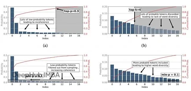 图(a)为初始 token 分布。图(b)为 top-p 采样。图(c)为 top-k 采样。图(d)为 min-p 采样。