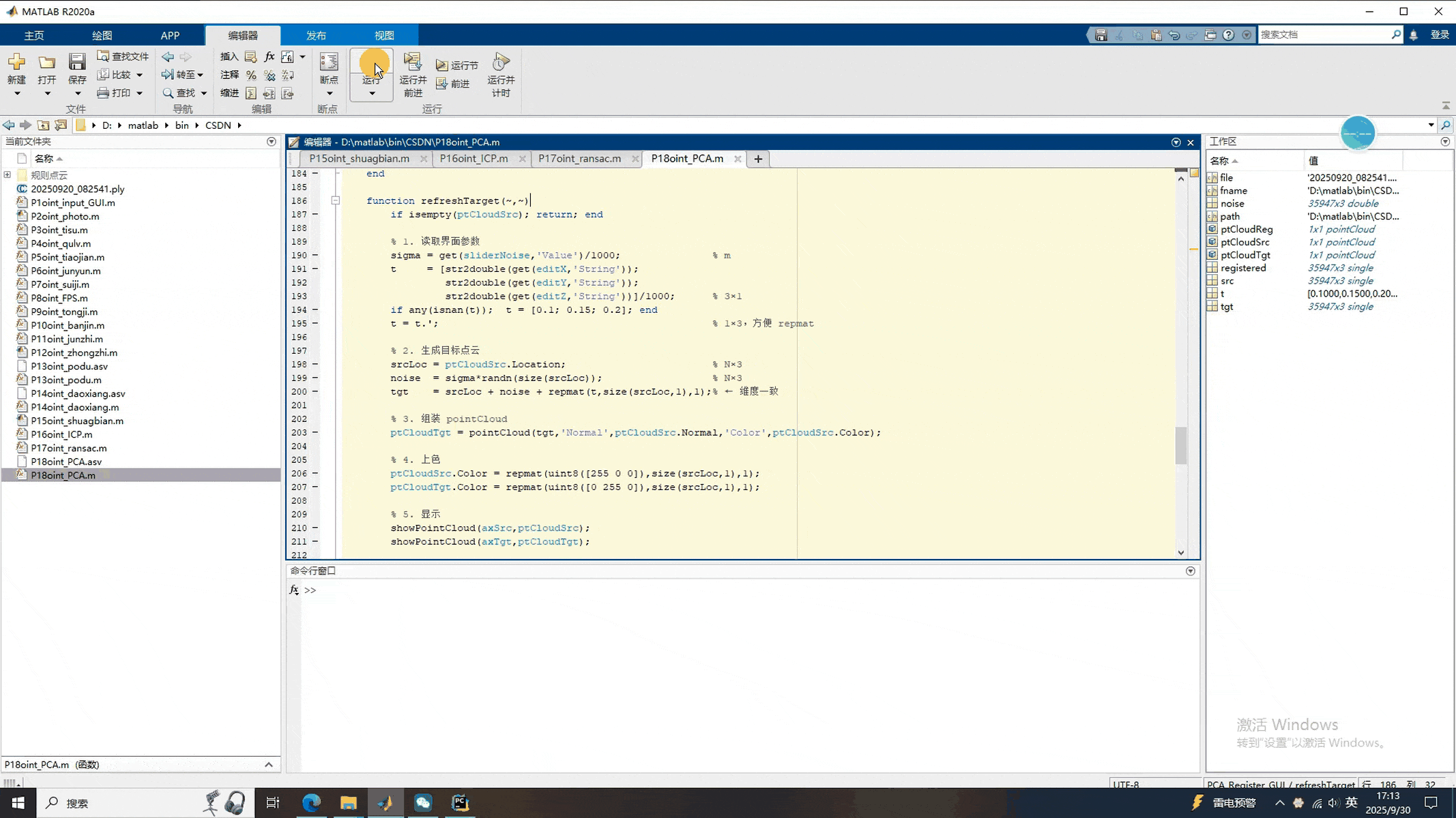 Matlab 作为强大的科学计算平台,提供了丰富的点云处理工具箱(如PointCloud类、pcregistercpd等函数),结合其矩阵运算优势,可高效实现 PCA 配准。PCA 配准的核心思想是:通过计算点云的协方差矩阵和特征向量,确定点云的主方向,再通过主方向对齐实现点云的初始位姿调整。