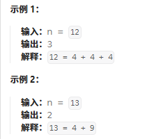 的完全平方数的最少数量 。完全平方数 是一个整数,其值等于另一个整数的平方;换句话说,其值等于一个整数自乘的积。例如,