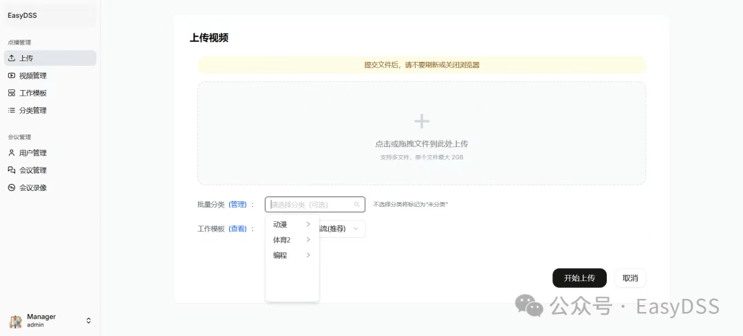 同时,上传阶段即可对视频进行分类管理——提前创建“企业培训”、“应急演练”、“项目复盘”等自定义分类,上传时直接归类,后续管理更清晰,无需二次整理。