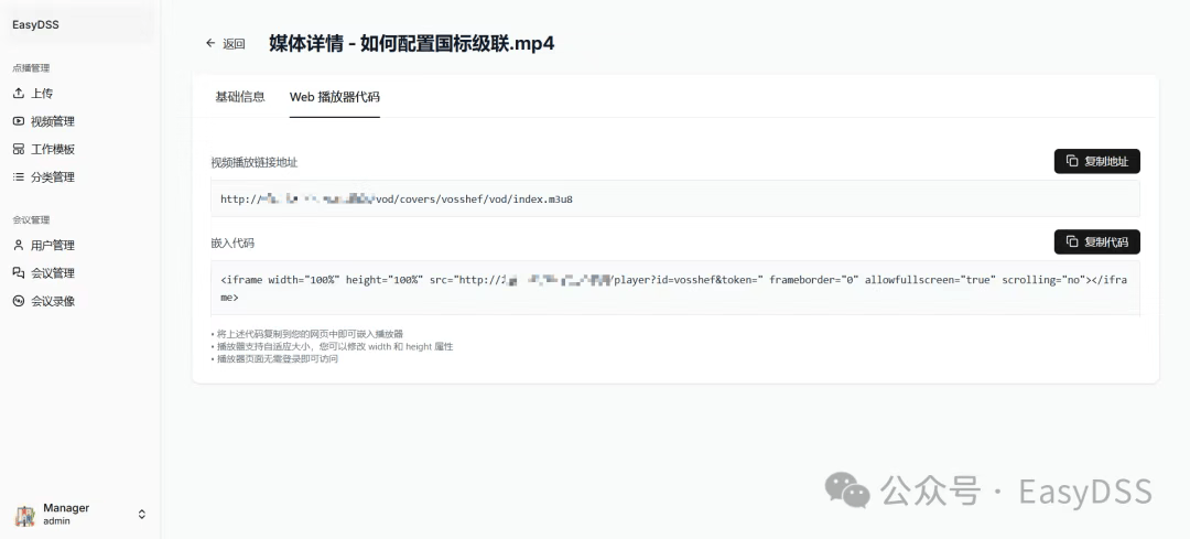 1)提供播放链接与嵌入代码,多平台轻松分发:每段点播视频都生成专属的播放链接地址和嵌入代码——若需分享给内部成员,直接发送链接即可;