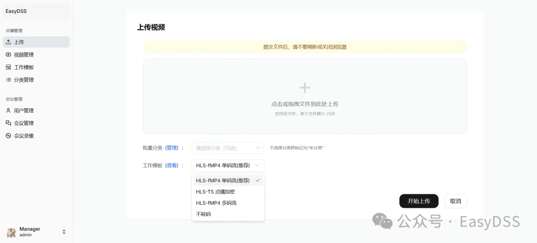 上传视频时,新版EasyDSS不再受单一格式限制,提供三种转码模式,适配不同播放场景: