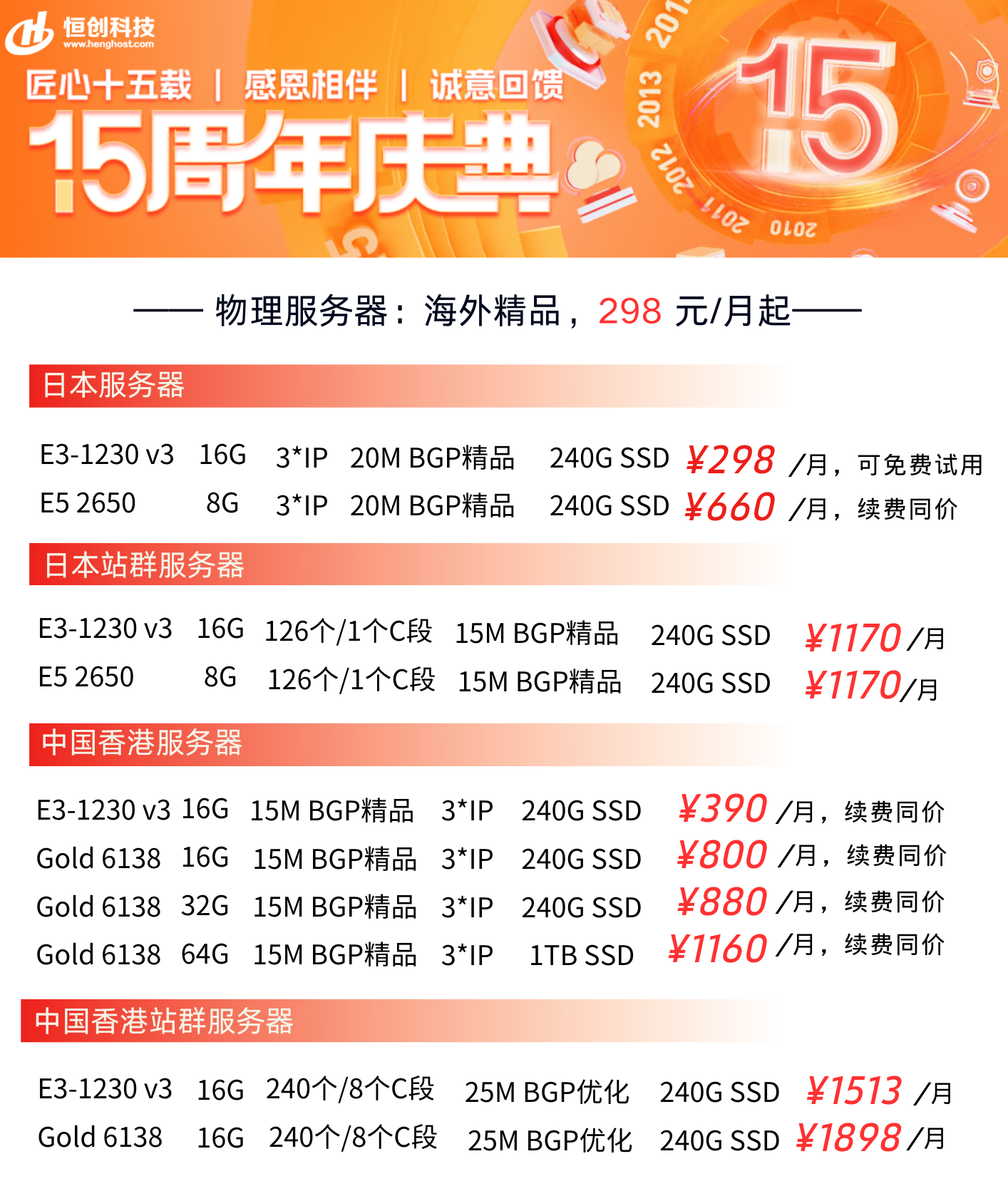 恒创 香港服务器套餐: