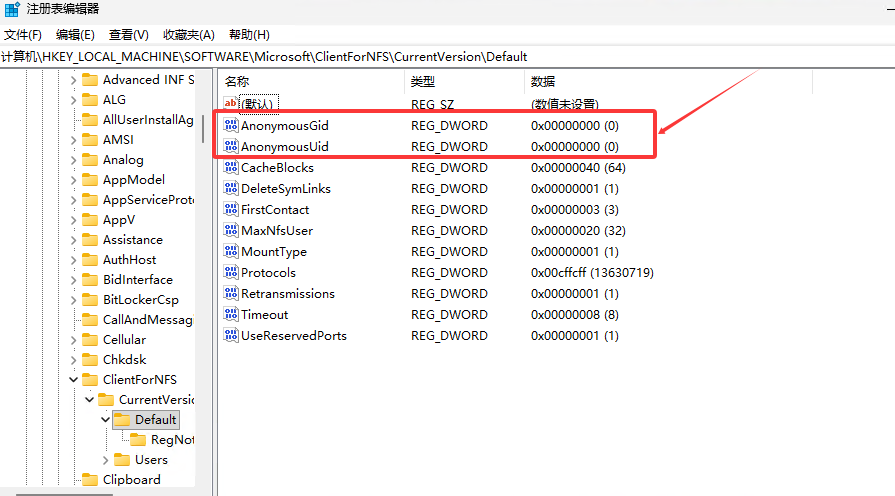 $regPath = "HKLM:\SOFTWARE\Microsoft\ClientForNFS\CurrentVersion\Default"# 确保该路径存在,如果不存在则创建
