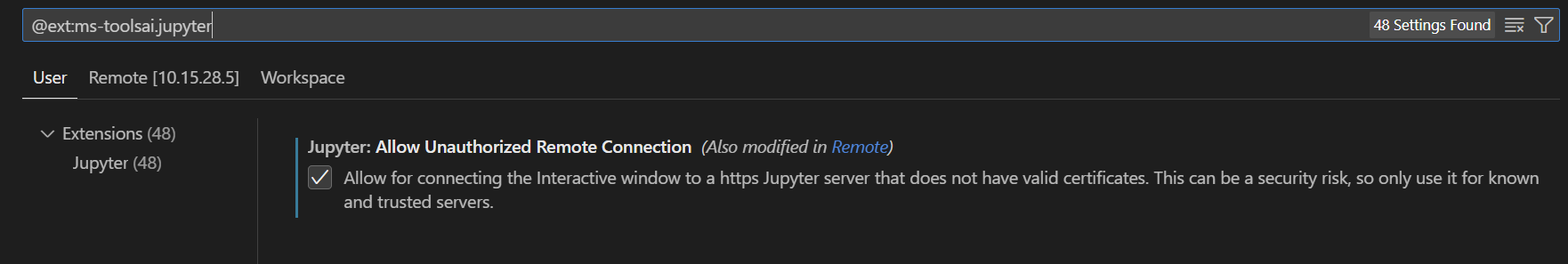 极有可能是Code-Server提供的Jupyter插件的问题,打开插件设置的第一行就可以看到安全相关的连接设置,结合insecure context的提示这是极为关键的一条设置。