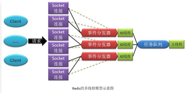 多线程 IO 模型中的“多线程”仅用于接受、解析客户端的请求,然后将解析出的请求写入到任务队列。而对具体任务(命令)的处理,仍是由主线程处理。