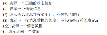 Redis 协议规定,Redis 文本是以行来划分,每行以 \r\n 行结束。每一行都有一个消息头,以表示消息类型。消息头由六种不同的符号表示,其意义如下: