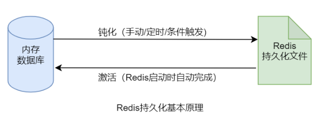通过手动方式,或自动定时方式,或自动条件触发方式,将内存中数据库的状态描述信息写入到指定的持久化文件中。当系统重新启动时,自动加载持久化文件,并根据文件中数据库状态描述信息将数据恢复到内存中,这个数据恢复过程也称为激活。这个钝化与激活的过程就是 Redis 持久化的基本原理。