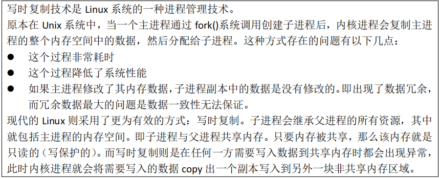 ⚠️ 写时复制影响性能 | 使用 fork() 创建子进程,写时复制(COW)机制在写密集场景下可能增加内存与 CPU 开销。 | |