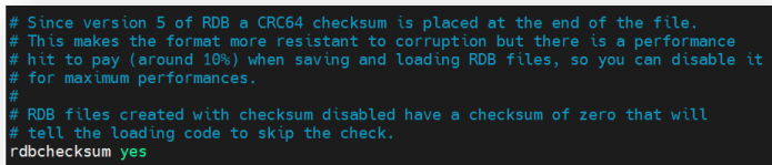 从 RDB5 开始,RDB 文件的 CRC64 校验和就被放置在了文件末尾。这使格式更能抵抗 RDB 文件的损坏,但在保存和加载 RDB 文件时,性能会受到影响(约 10%),因此可以设置为 no 禁用校验和以获得最大性能。