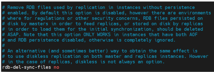 主从复制时,是否删除用于同步的从机上的 RDB 文件。默认是 no,不删除。