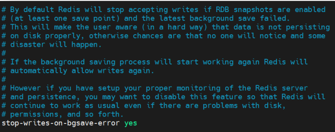 默认情况下,如果 RDB 快照已启用(至少一个保存点),且最近的 bgsave 命令失败,Redis 将停止接受写入。