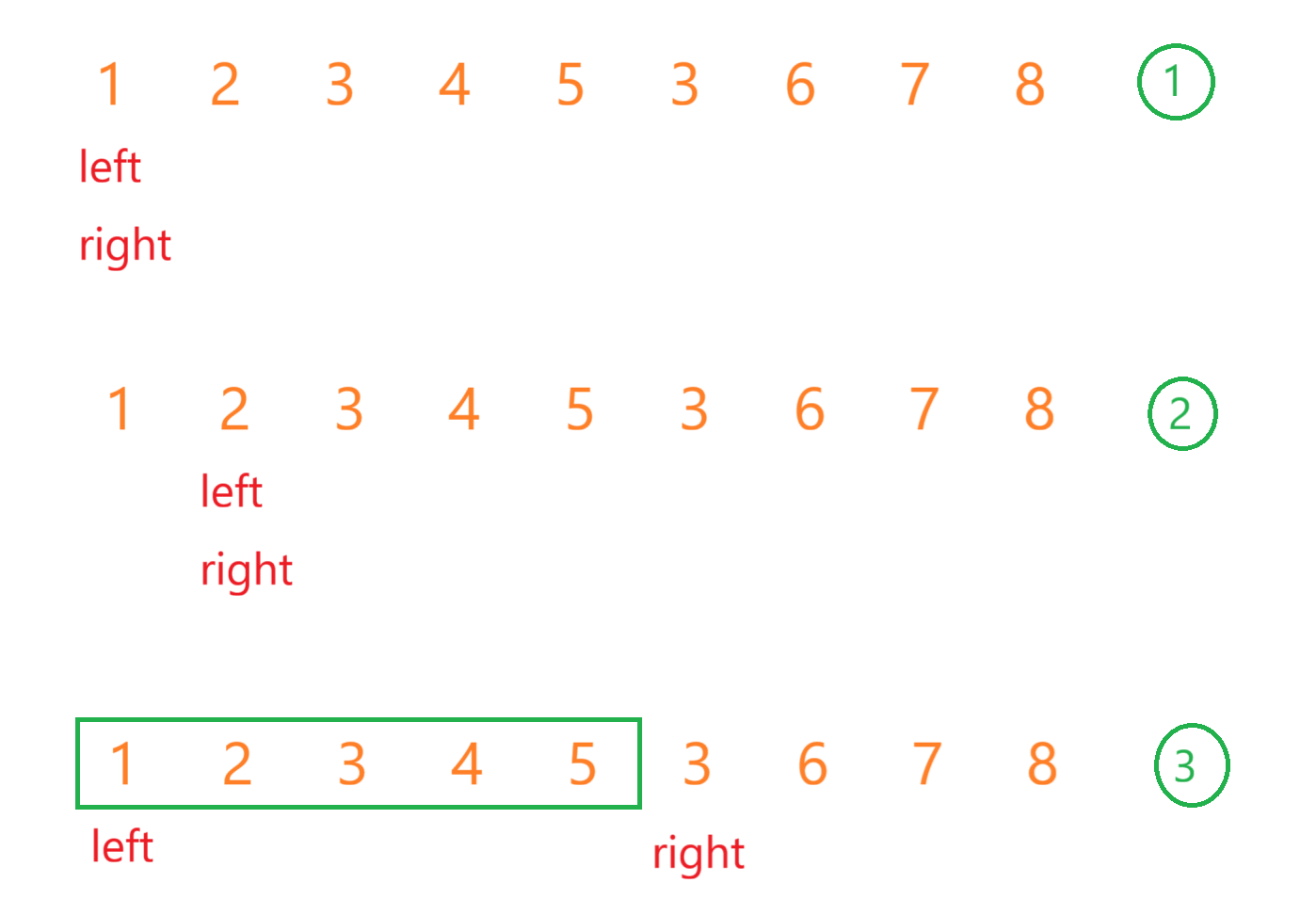 双层for循环的时间复杂度之所以高就是因为它把所有的情况全部枚举了出来,每当出现了一个重复的元素,left和right都要重新指向下一个起始位置,对于圈3(上图所示)来说,绿色框出的部分是没有重复元素的,但就是由于里边有个3,当right指向3的时候就和前边的3重复了,在下标为[1,3]这个区间里边,right其实是没有必要回退的,因为每次right走的都是重复的区间,而且每次right走到3的时候都会导致区间内的元素发生重复。当left指向4的时候,right也没有必要回退到4的位置,因为4,5两个元素是会要便利到的。因此,经过上边的分析,我们得出这道题目的两个指针是不用回退的,就可以用双指针来解决这道题。