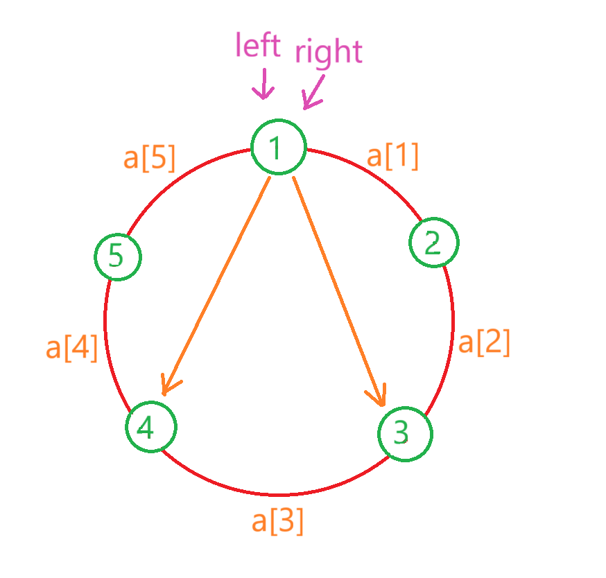 上图的a[i]表示第1个小朋友到第i+1个小朋友的距离,假设所有a[i]加起来的总距离为sum,1~3顺时针距离为k(此时的 k < (sum / 2) ),如果k再累加一个a[3],此时k > (sum / 2),那么3号小朋友就是1号小朋友顺时针方向的最远小朋友。同理,4号小朋友就是1号小朋友逆时针方向的最远小朋友。接下来比比1~3(顺时针)的距离长还是1~4(逆时针)的距离长就行了。至此,我们就找到了离1号小朋友最远的那个小朋友。