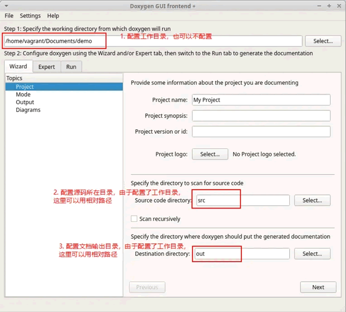 安装 gui,就可以像 windows 那样使用图形化操作了,图形界面可以通过 doxywizard 命令运行。