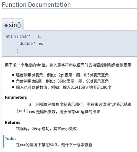 /*! \file math.h *//*!用于求一个角度的sin值,输入是字符串以便同时支持弧度制和角度制表示\li 弧度制用pi表示,例如:2pi表示一圈、0.5pi表示直角\li 角度制用d结尾,例如:360d表示一圈、90d表示直角\li 输入也可以是数值,例如:输入3.14159大约表示180度\param a 用弧度制或角度制表示都行,字符串必须用'\0'表示结束\param[out] res 是输出参数,用于保存sin运算的结果\return 错误码,0表示成功,其它表示失败\todo 在xxx的情况下存在BUG,预计下一版本修复