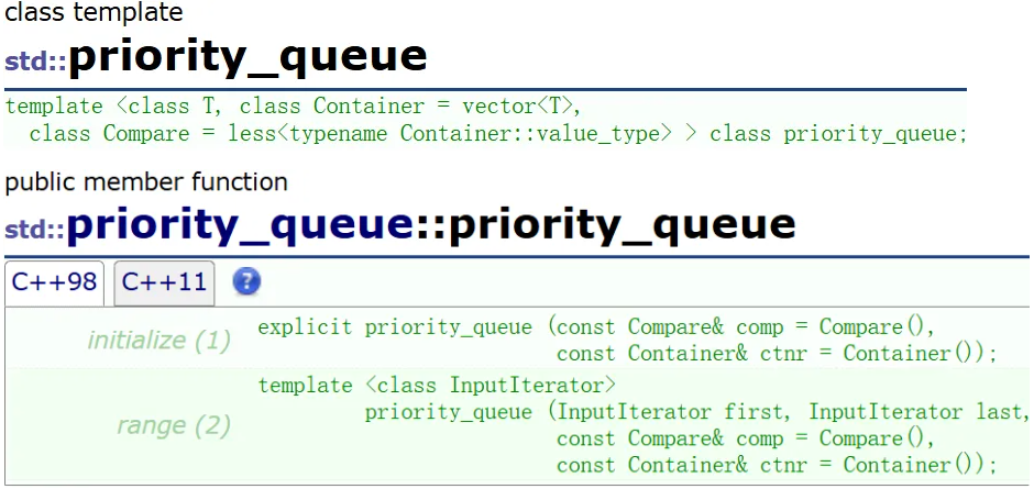 {template <class T, class Container = vector<T>, class Compare = less<T>>class priority_queue{ };class Date{public:Date(int year = 1900, int month = 1, int day = 1): _year(year), _month(month), _day(day){ }bool operator<(const Date& d)const{return (_year < d._year) ||(_year == d._year && _month < d._month) ||(_year == d._year && _month == d._month && _day < d._day);}bool operator>(const Date& d)const{return (_year > d._year) ||(_year == d._year && _month > d._month) ||(_year == d._year && _month == d._month && _day > d._day);}friend ostream& operator<<(ostream& _cout, const Date& d);private:int _year;int _month;int _day;};ostream& operator<<(ostream& _cout, const Date& d){_cout << d._year << "-" << d._month << "-" << d._day;return _cout;}void test_priority_queue3(){priority_queue<Date> pq;pq.push(Date(2015, 9, 3));pq.push(Date(2019, 10, 1));pq.push(Date(1949, 10, 1));while (!pq.empty()){cout << pq.top() << " ";pq.pop();}cout << endl; // 2019-10-1 2015-9-3 1949-10-1}void test_priority_queue4(){priority_queue<Date, vector<Date>, greater<Date>> pq;pq.push(Date(2015, 9, 3));pq.push(Date(2019, 10, 1));pq.push(Date(1949, 10, 1));while (!pq.empty()){cout << pq.top() << " ";pq.pop();}cout << endl; // 1949-10-1 2015-9-3 2019-10-1}