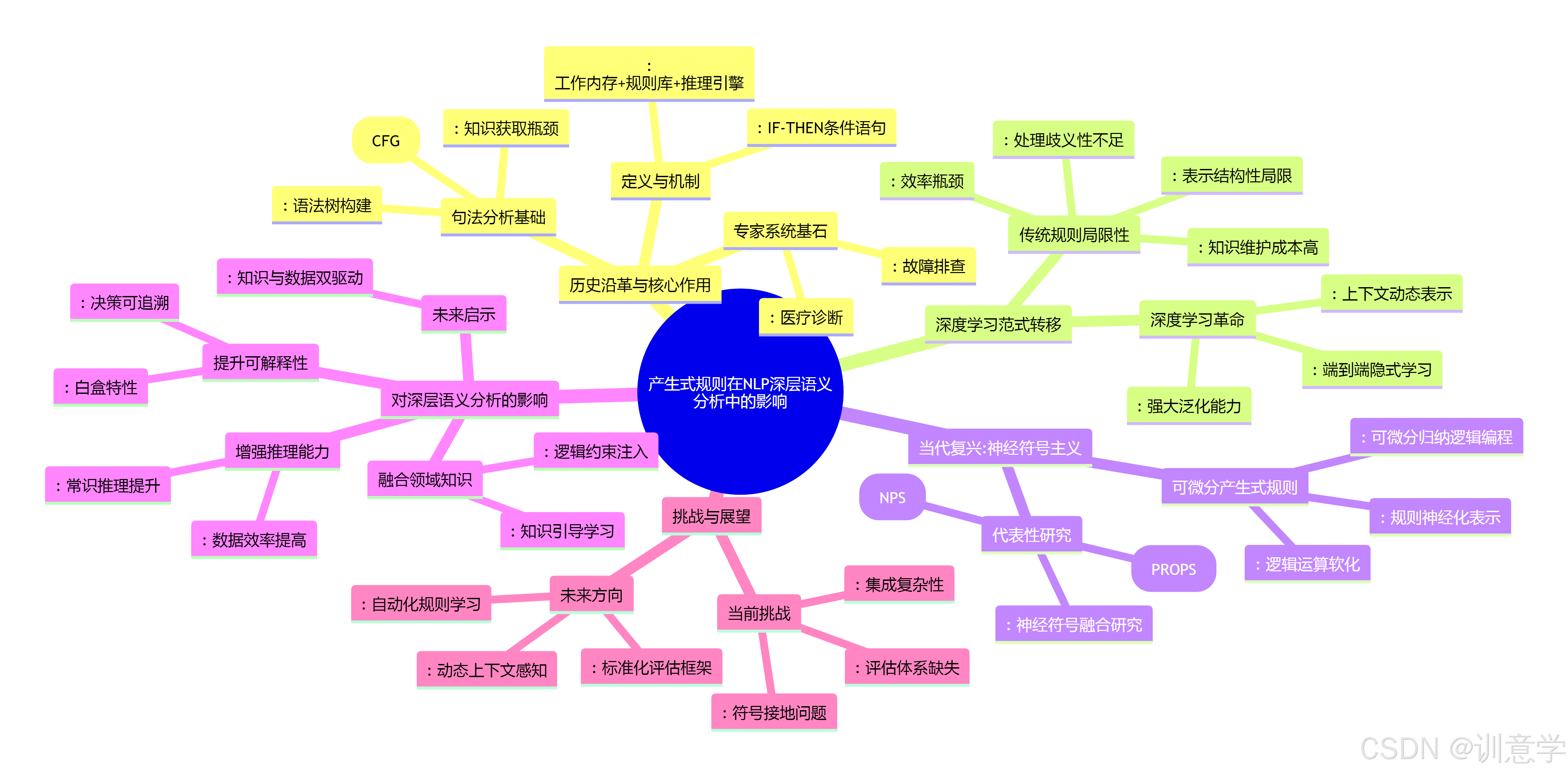 本报告旨在深入探讨产生式规则(Production Rule)在人工智能(AI)的自然语言处理(NLP)领域,特别是对深层语义分析所产生的历史影响、当代挑战与未来启示。研究表明,产生式规则作为早期AI知识表示与推理的核心,为NLP的句法分析奠定了基石。然而,随着深度学习模型的兴起,NLP的范式发生了根本性转变,传统的、基于硬编码规则的方法在处理语言的复杂性、歧义性和上下文动态性方面显示出巨大局限性 。尽管如此,产生式规则并未被完全摒弃。在2020年至2025年间,研究趋势清晰地指向一个将符号主义(以产生式规则为代表)与连接主义(以神经网络为代表)相结合的“神经符号”新范式。通过将规则转化为可微分的形式并集成到神经网络中,产生式规则正在以一种新的形态复兴,旨在解决当前深度学习模型在可解释性、常识推理和知识引导方面的核心挑战,从而为实现更深层次、更鲁棒的语义理解提供了关键启示。