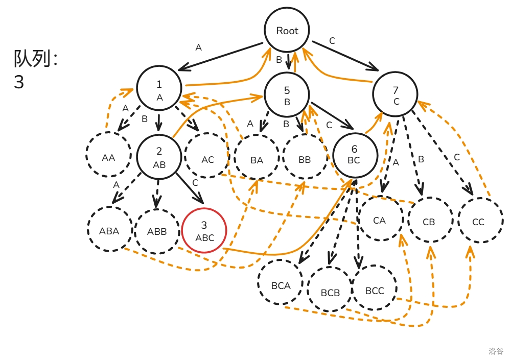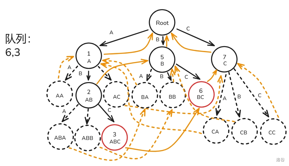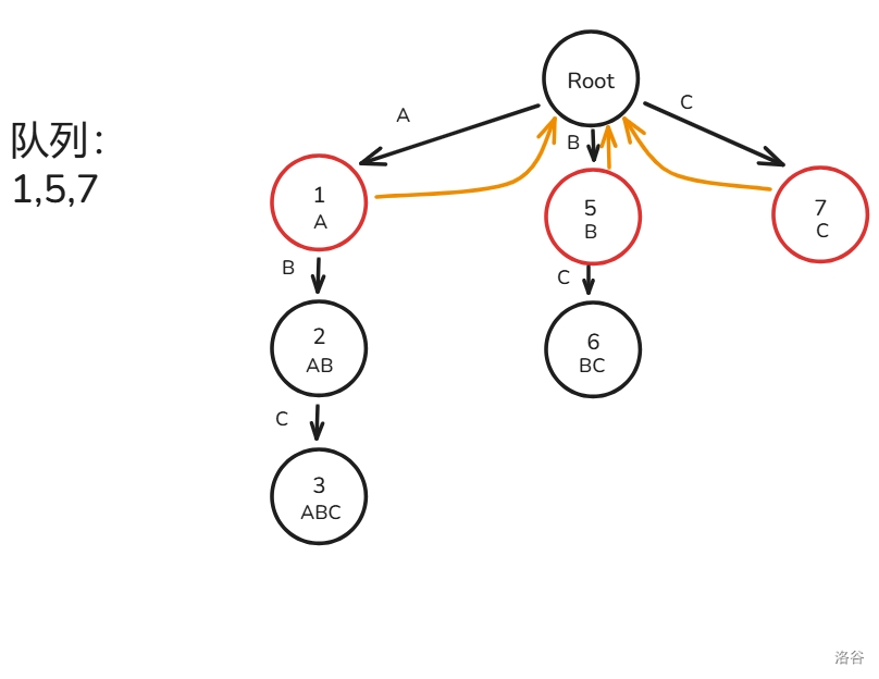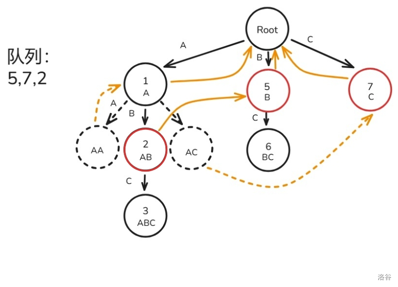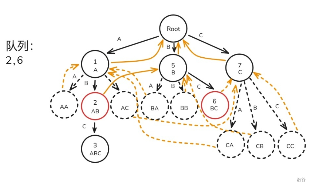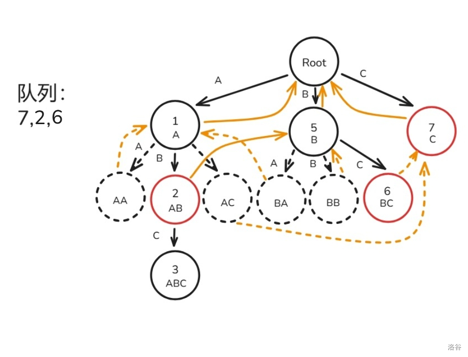 - 将根节点的所有子节点入队,根节点的虚拟节点的 failfailfail 都指向根。