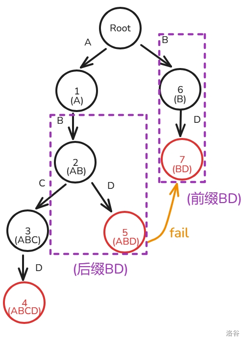 的子节点,所以 fail5=t6,D=7fail_5=t_{6,D}=7fail5=t6,D=7。