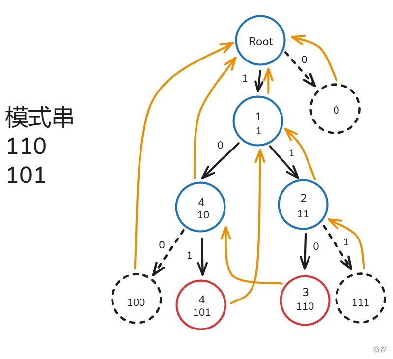 我们想要一个满足条件的字符串,在匹配时就不能经过模式串尾节点或直接 / 间接通过 failfailfail 能到达的模式串尾节点的节点,那我们应该怎样走呢?