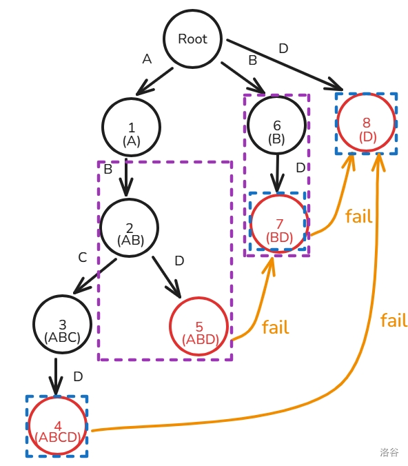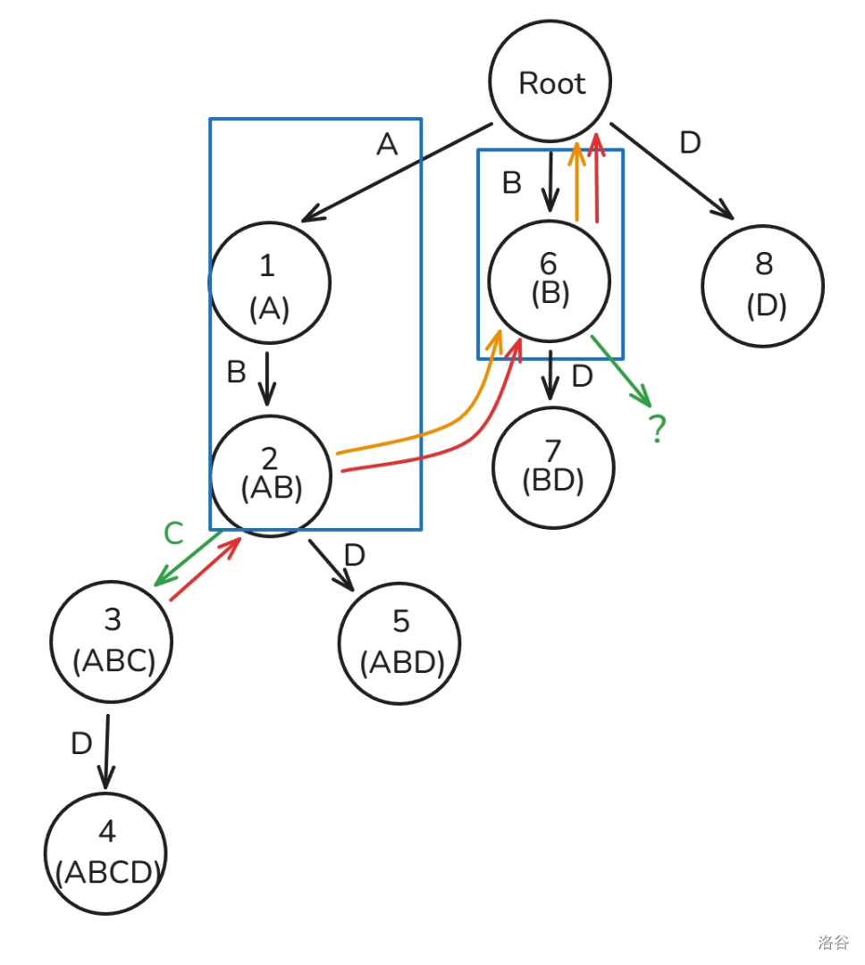 的子节点,所以我们想要答案最优,就得继续跳,我们跳到 fail6fail_6fail6,也就是根节点,虽然这里仍然没有相邻为 D