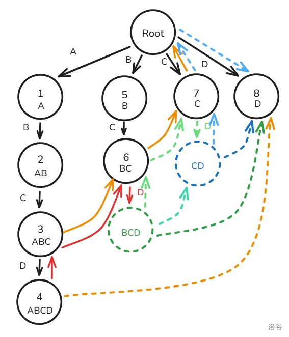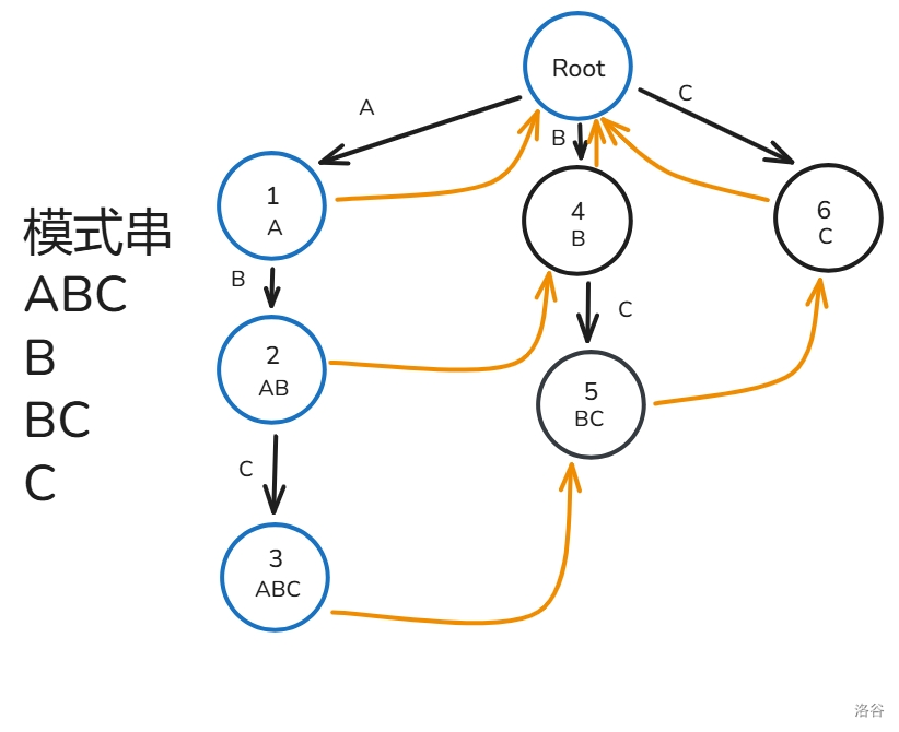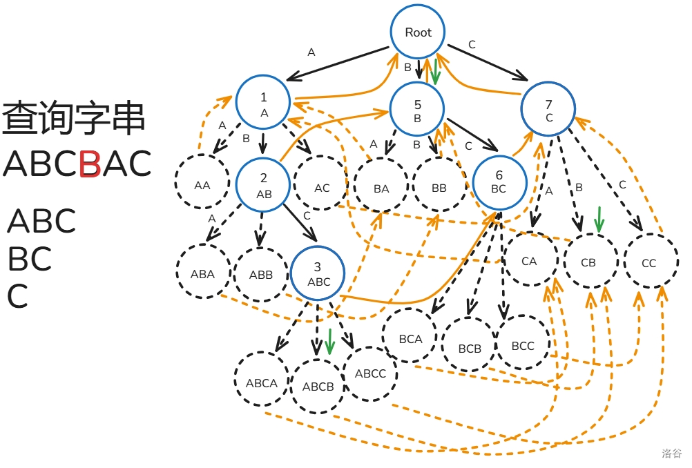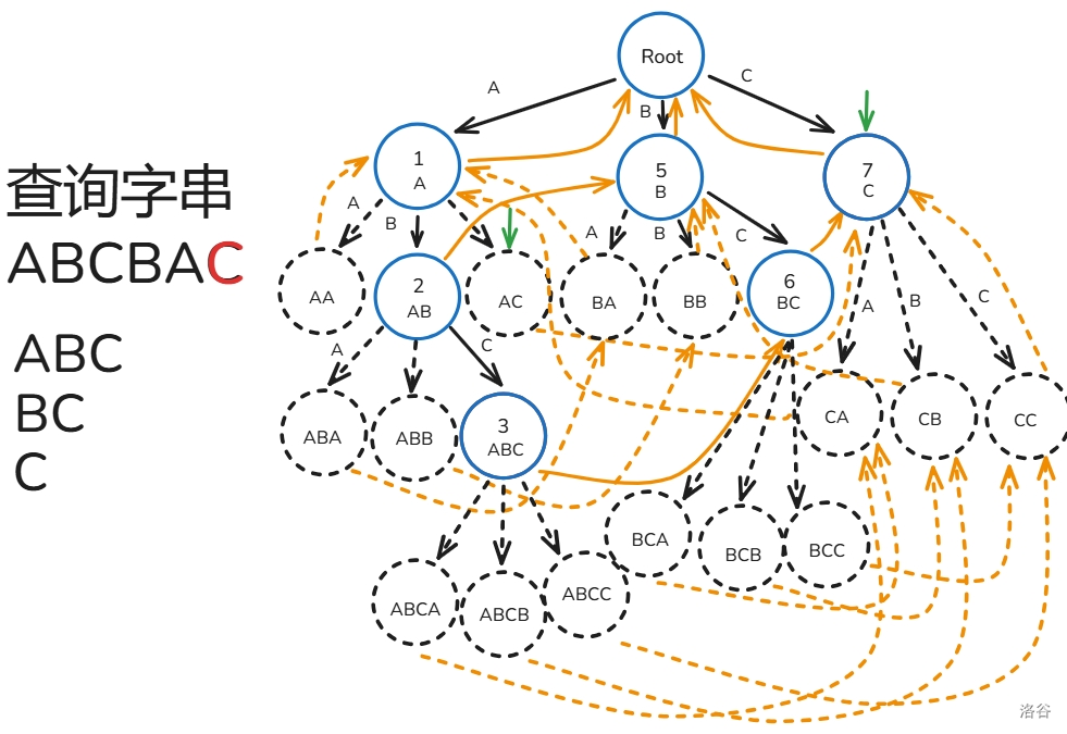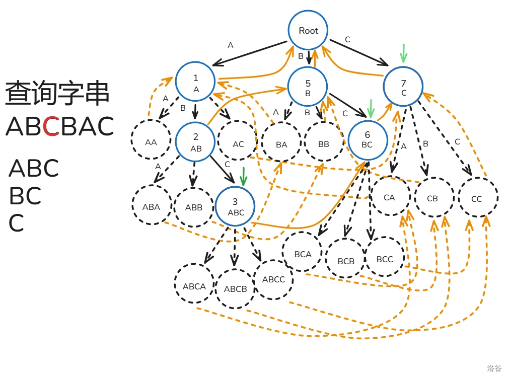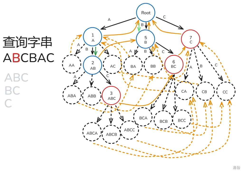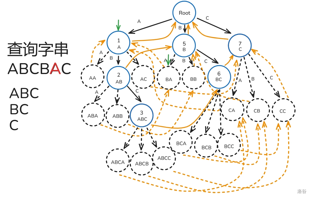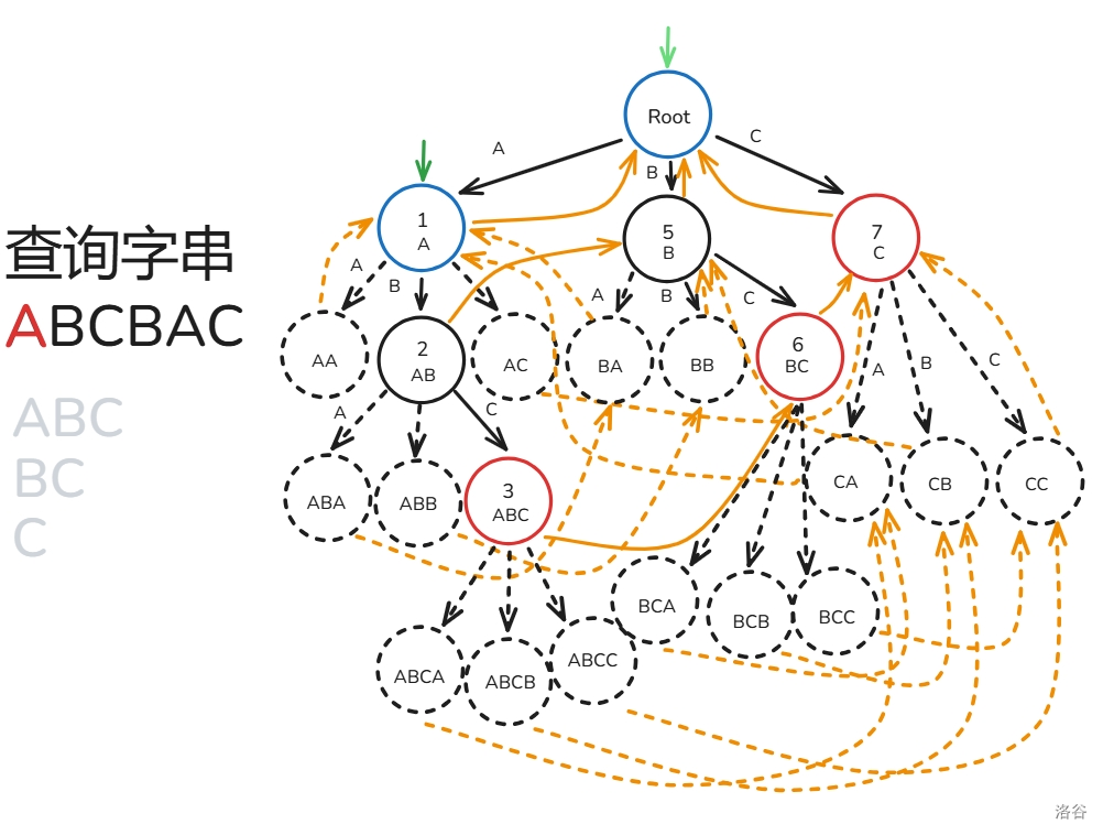 AC 自动机由两个部分构成:原本的 Trie 和若干个失配指针