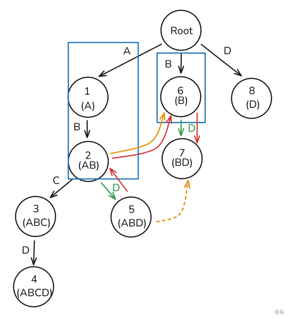 但是,如果一直暴力跳 failfailfail,复杂度最坏是 O(n)O(n)O(n) 的,我们如何才能优化呢?我们可以建若干个虚拟节点,而这个节点指向它的 failfailfail。