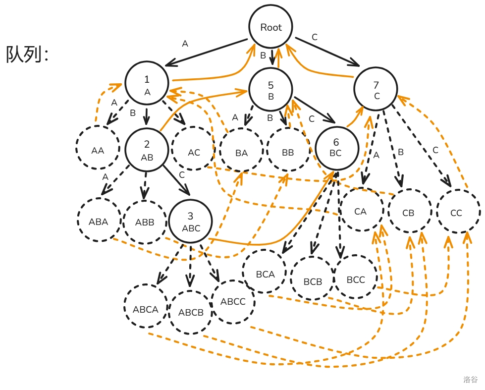- 每次取出队首的节点 xxx,枚举每一个字符 iii,若 tx,it_{x,i}tx,i 是空的,建出 xxx 的所有虚拟节点指向那个节点的 failfailfail,可以写成: