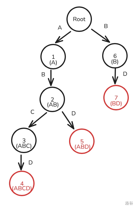 定义 iii 属于的子串为从根节点 RootRootRoot 所出发到节点 iii,途中经过的字符组成的字符串。