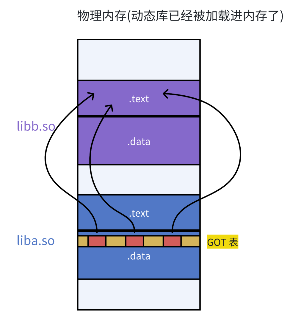 - 由于代码段只读,我们不能直接修改代码段。但有了GOT表,代码便可以被所有进程共享。但在不同进程的地址空间中,各动态库的绝对地址、相对位置都不同。反映到GOT表上,就是每个进程的每个动态库都有独⽴的GOT表,所以进程间不能共享GOT表。