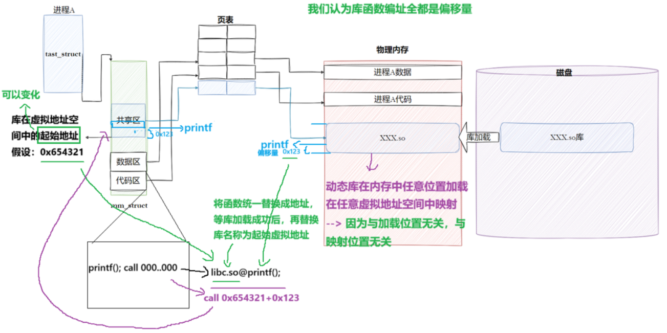 注意:也就是说,我们的程序运行之前,先把所有库加载并映射,所有库的起始虚拟地址都应该提前知道.然后对我们加载到内存中的程序的库函数调⽤进⾏地址修改,在内存中二次完成地址设置(这个叫做加载地址重定位)