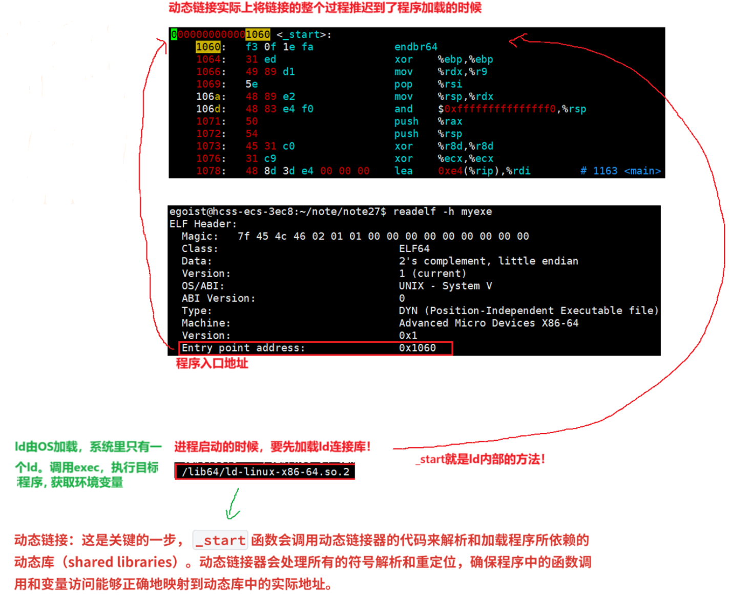 3.动态链接:这是关键的⼀步 , _start 函数会调用动态链接器的代码来解析和加载程序所依赖的动态库(shared libraries)。动态链接器会处理所有的符号解析和重定位,确保程序中的函数调用和变量访问能够正确地映射到动态库中的实际地址。