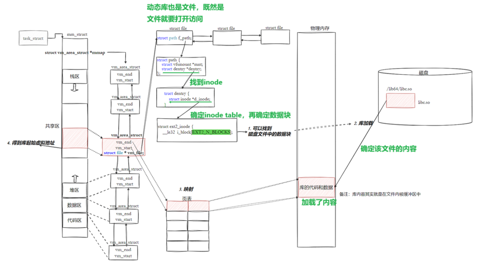 - 让我们的进程找到动态库的本质:也是⽂件操作,不过我们访问库函数,通过虚拟地址进行跳转访问的,所以需要把动态库映射到进程的地址空间中