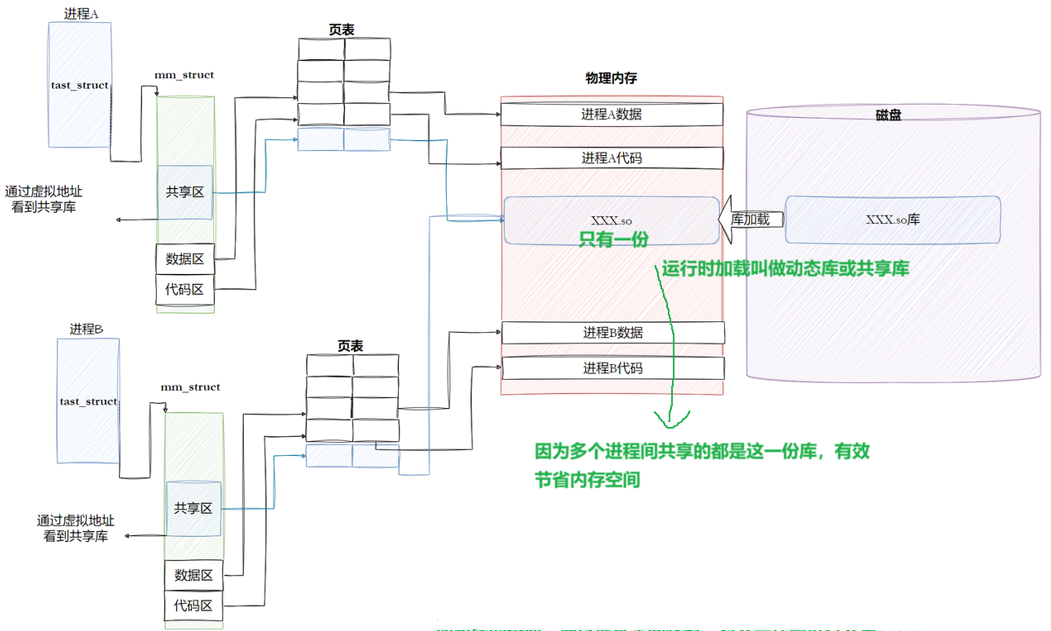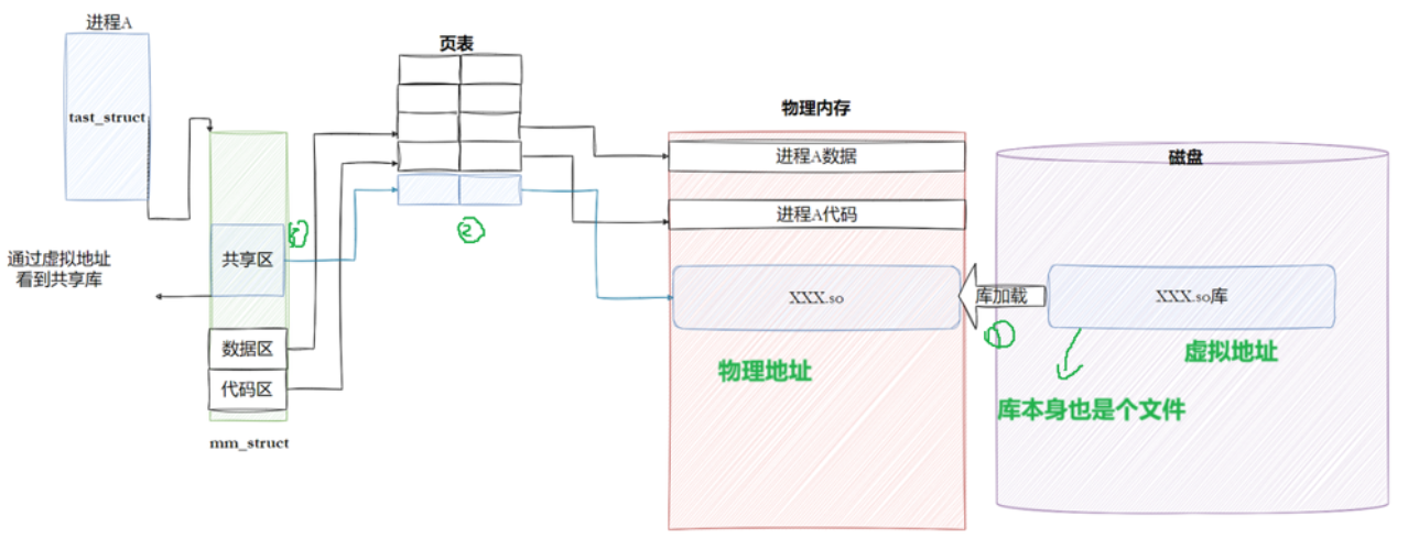 那么进程是如何看到对应的动态库文件的?库文件也要加载到物理内存,要建立虚拟到物理映射关系,那么就可以通过虚拟地址空间找到需要的物理内存.